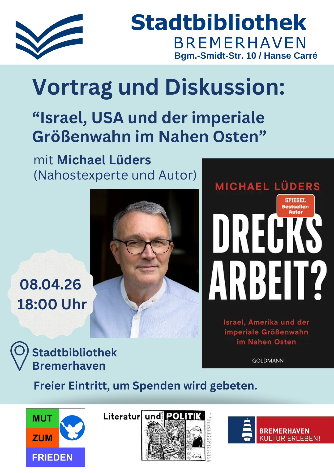 Veranstalter: Initiative „Mut zum Frieden Bremerhaven“ in Kooperation mit Literatur und Politik e.V. und Stadtbibliothek Bremerhaven.